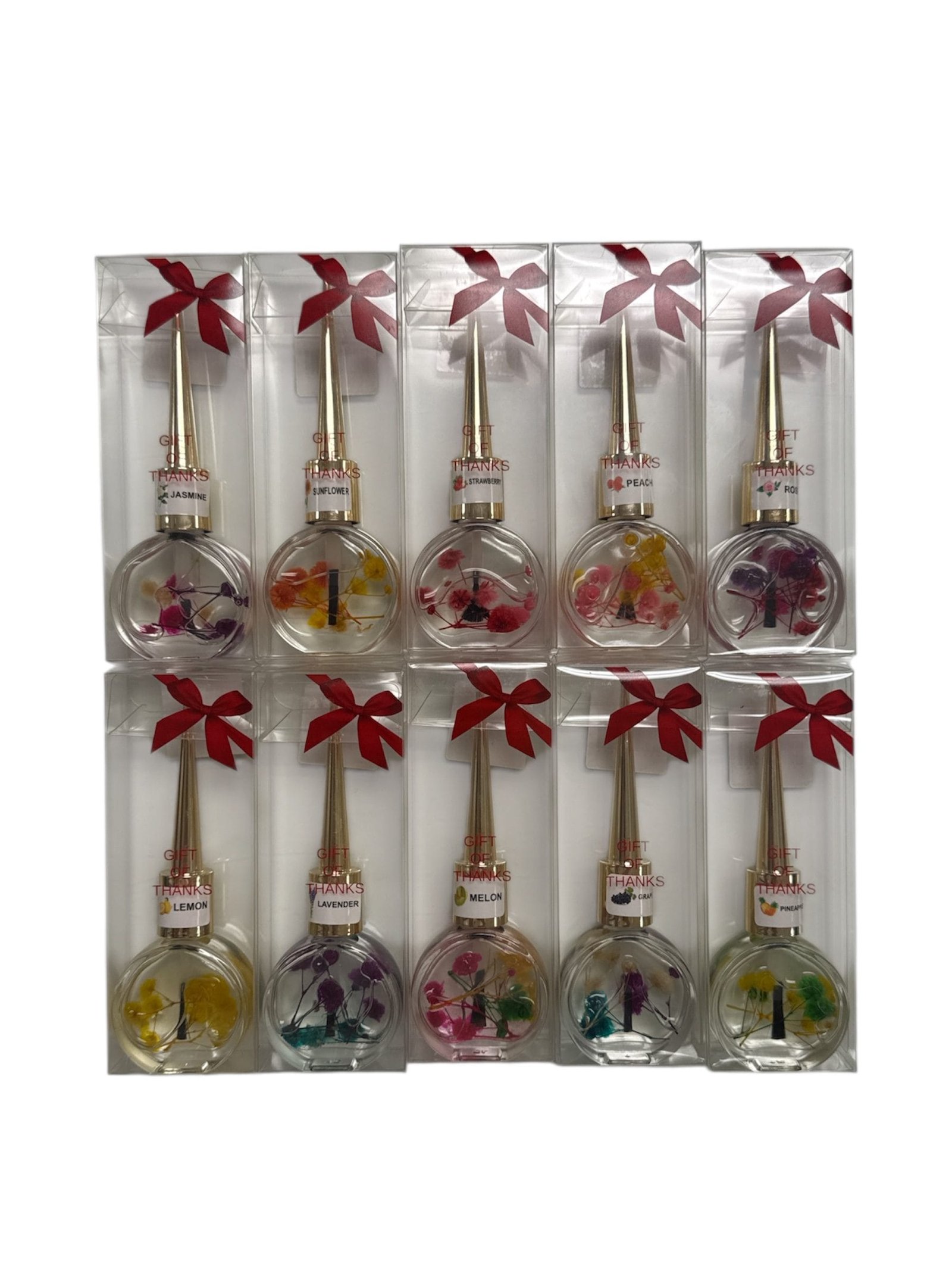 Grape, Jusmine, Lavender, Lemon, Melon, Peach, Pinaple, Rose, Strawberry, Sunflower